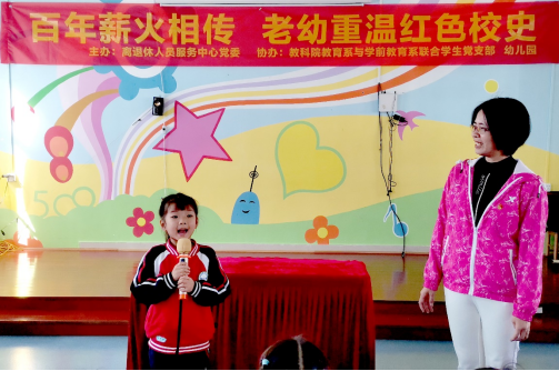 11月11日上午,离退休人员服务中心党委、教科院教育系和学前教育系学生联合党支部和幼儿园党支部在幼儿园活动室举办了的主题党日活动,教科院学生党员梁影仪同学为小朋友讲述学校前身广东省立雷州师范学校时期校友、抗日英雄黄其炜烈士的英勇故事。