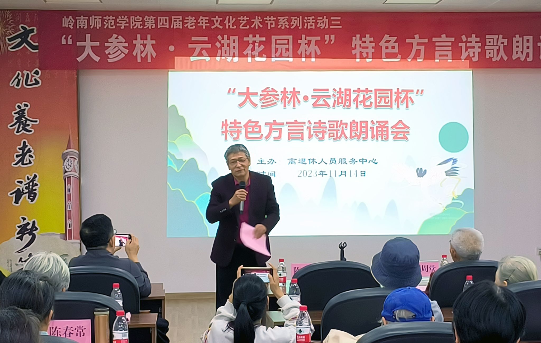 1114日下午,学校第四届老年文化艺术节系列活动三—— 特色方言诗歌朗诵会在离退休人员服务中心会议室成功举办。此次活动由“大参林·云湖花园”冠名赞助,旨在丰富老同志的文化生活,展现我国地方语言特色,增强师生的文化自信。活动由离退休人员服务中心副科长刘汉先主持。