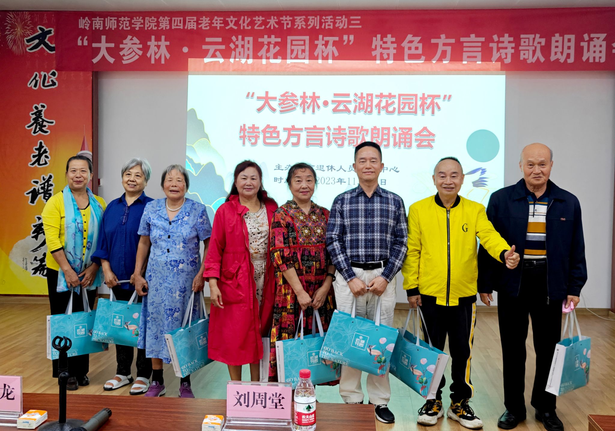活动结束后,原学校副校长刘周堂、学校党委宣传部副部长郭莉敏、大参林·云湖花园营销经理容兴敏为参与此次“大参林·云湖花园杯”特色方言诗歌朗诵会的选手送上精美的礼品并合影留念。