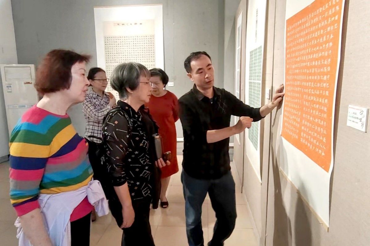 当天上午,学员们来到展厅,现场布置得古色古香,空气中弥漫着墨香。展厅内陈列着数百幅书法作品,有的气势磅礴,有的婉约秀丽,有的刚劲有力,有的柔美细腻。每一幅作品都凝聚着书法学子的勤劳和智慧,展现出中华文化的独特魅力。在工作人员的引导下,学员们有序参观各种风格的书法作品,欧海清和叶德波不时跟学员们亲切交流参观书法的心得。书法班老师刘华敏耐心地向学员讲解所展出作品的风格特点,这些作品既有传统书法的韵味,也有现代书法的创新,让学员们感受到了书法艺术的博大精深。