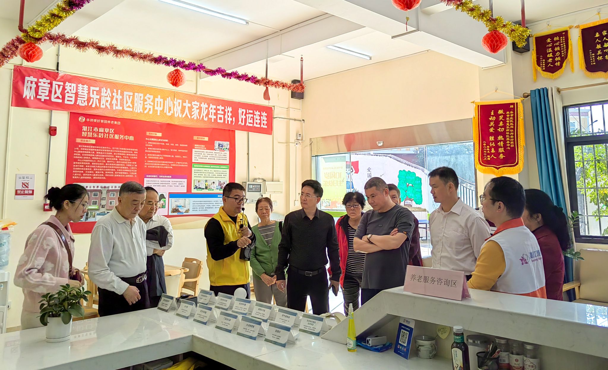 为进一步提高社区居家养老认识,转变养老服务观念,35日上午,离退休人员服务中心党委书记、主任欧海清带领部门工作人员和离退休党支部书记、片区长代表一行13人深入“湛江慧养”——麻章区智慧乐龄社区服务中心参观调研,谋划搭建老同志“社区居家养老绿色通道”。