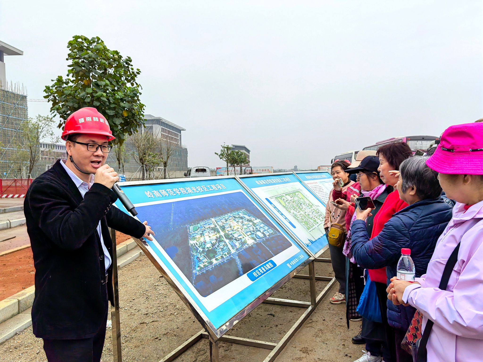 湖光校区建设与管理办公室副主任林三清现场为老同志作了详细讲解。据介绍,学校湖光校区建设项目是省市重点建设项目,广东教育发展“十四五”规划重大建设项目。校区占地1560.79亩,总建筑面积58万平方米,按容纳18500名学生建设,总投资约28亿元。其中,首期占地800亩,建筑面积24.35万平方米,办学规模约8000人,计划于今年9月部分建成投入使用。届时,我校将形成一校多区的办学格局,为学校加快建成与区域教育、产业高质量发展高度融合、服务能力突出、特色鲜明的高水平师范大学提供重要支撑。