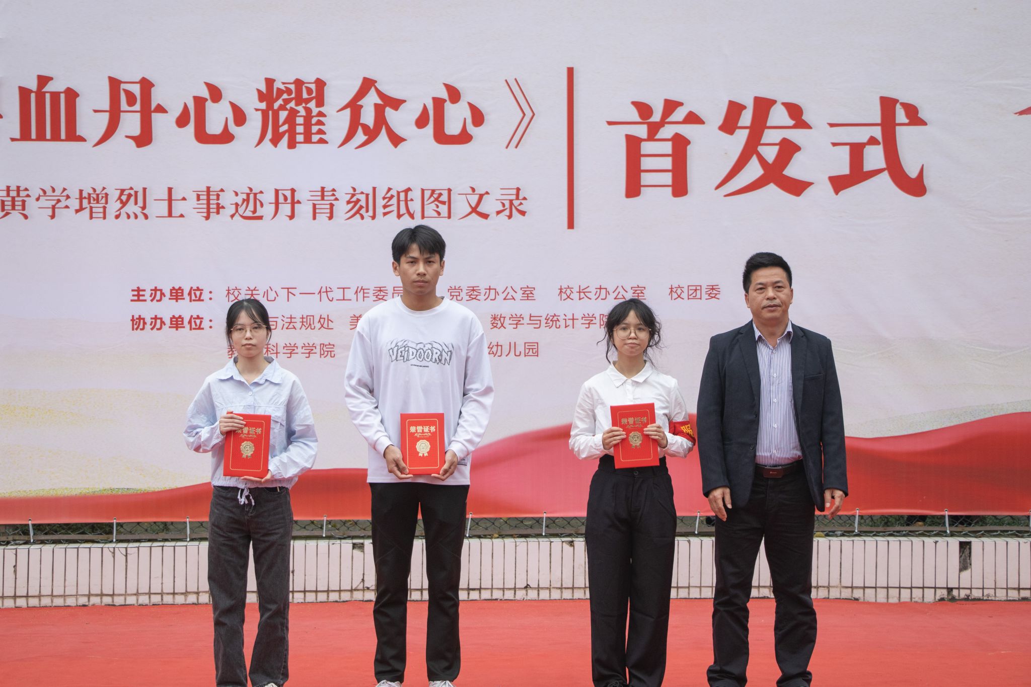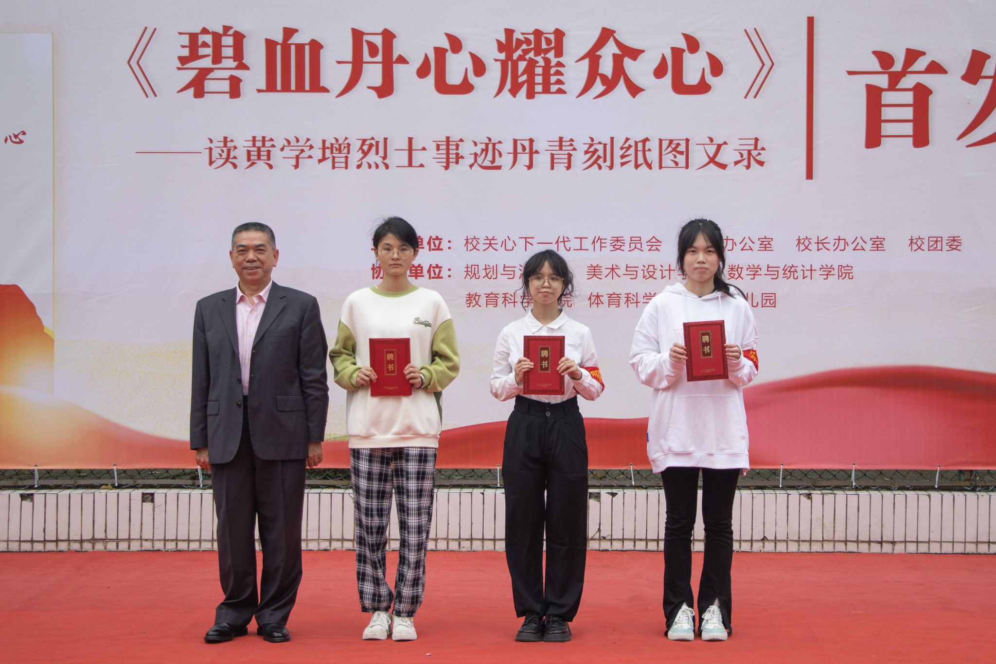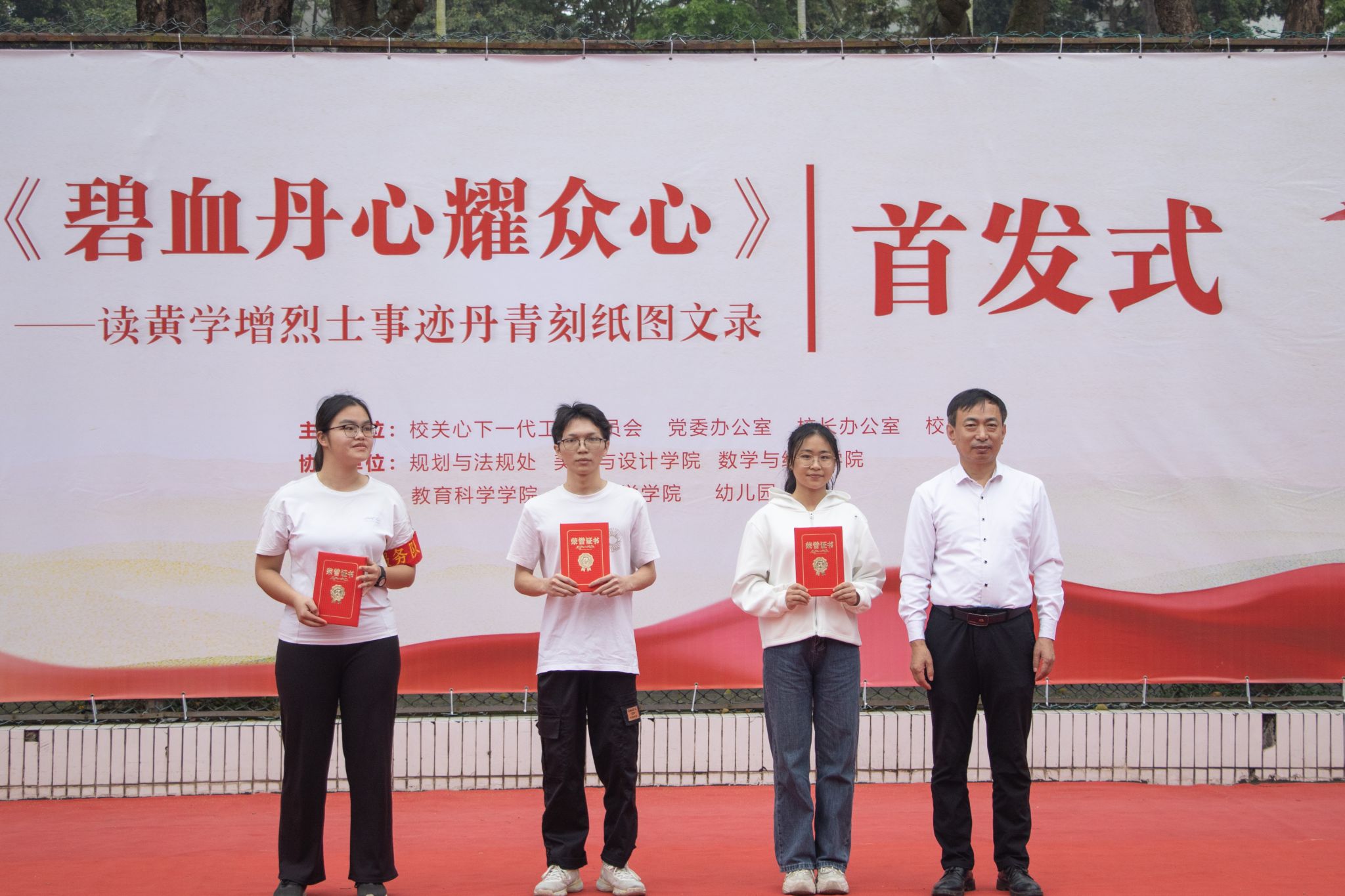 学校党委书记兰艳泽为首发活动致辞,校关工委主任刘海涛为朝阳读书会、丹青刻纸班、书法班辅导员颁发聘书,党委常委、宣传部部长刘坤章为《碧血丹心耀众心》刻纸作品作者颁奖,党委常委、组织部部长赫云鹏为“青年志愿者”积极分子颁奖。