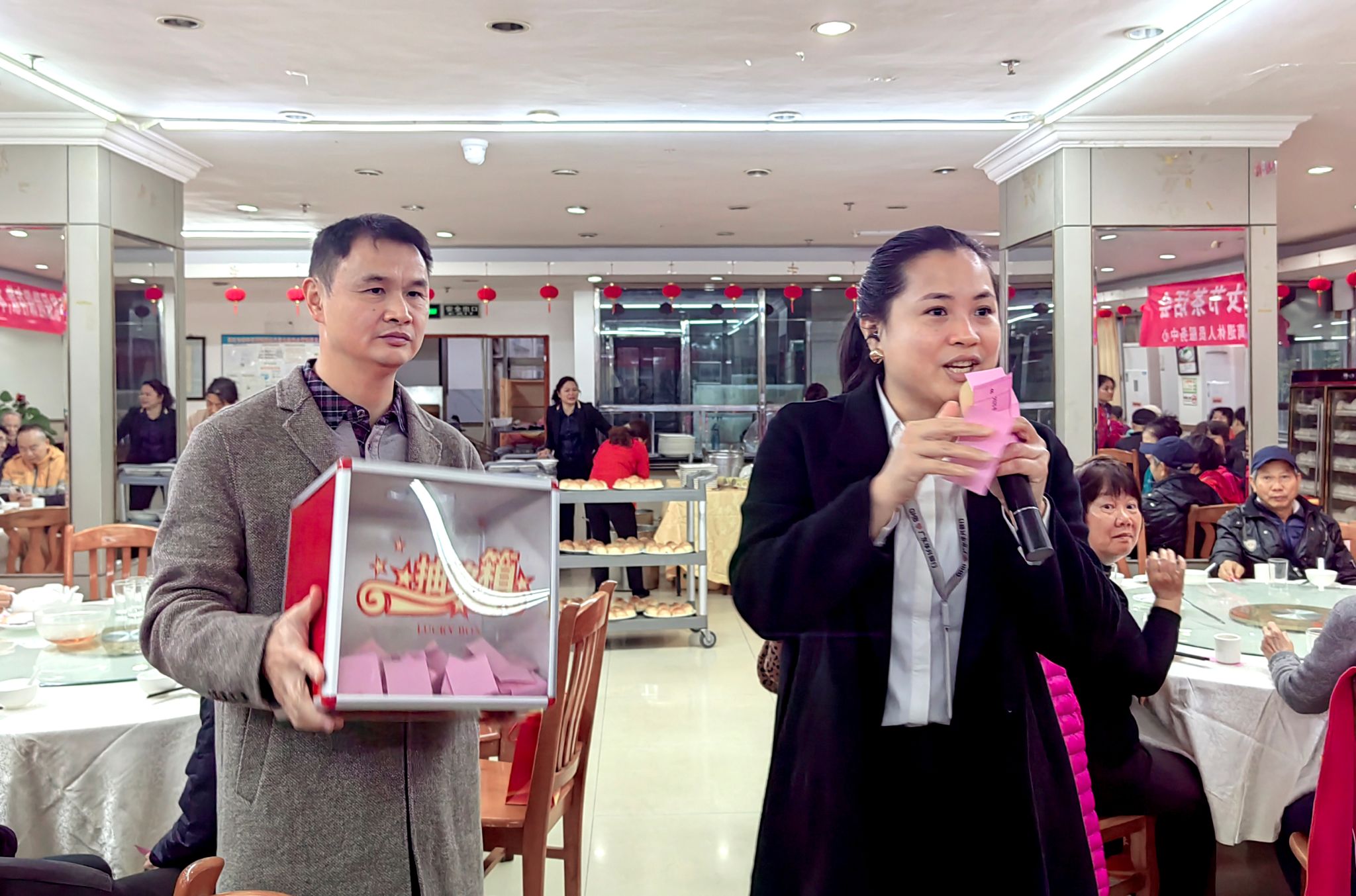 活动期间,离退休人员服务中心携手广东华兴银行湛江分行、中粮集团“中粮到家”精心为离退休女教职工准备了节日爱心礼物,传递着浓浓的节日问候。为增添乐趣、活跃气氛,还特别安排了抽奖活动。叶德波和华兴银行营业部副总经理廖新分别为老同志们抽取了一、二、三等奖,并现场为中奖人员进行了颁奖。获奖者脸上洋溢着幸福笑容,未中奖的老同志也被现场欢乐氛围感染,喜笑颜开。