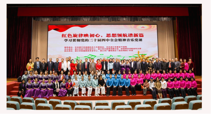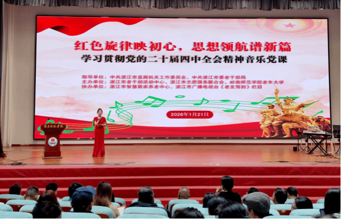 1月21日,以“红色旋律映初心,思想领航谱新篇”为主题的学习贯彻党的二十届四中全会精神音乐党课,在岭南师范学院音乐厅顺利举行。本次活动由中共湛江市直机关工委、湛江市委老干部局指导,岭南师范学院老年大学与湛江市老干部活动中心、志愿服务联合会共同举办岭南师范学院党委副书记林晓敏,市委组织部副部长、老干部局局长何江,市直机关工委书记黄真窦领导嘉宾出席活动
