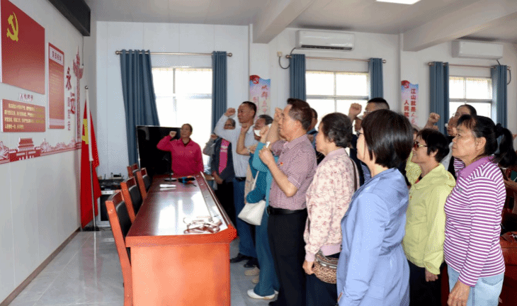 活动首站走进岭北镇调丰古村。在村党员活动室,全体党员在第六党支部书记黄树彬领誓下,庄严重温入党誓词,筑牢信仰根基。随后在调丰村程校长引导下,党员们依次参观“三个第一”文化景观、东坡井、景兰阁、古民居与宗祠,沉浸式感受 800 年古村的深厚人文底蕴;漫步千年古官道遗址,体悟历史岁月的厚重沉淀。在古村活化、人居环境整治现场,党员们认真学习“百千万工程”典型经验,对古村保护与乡村发展融合的实践成效纷纷点赞。