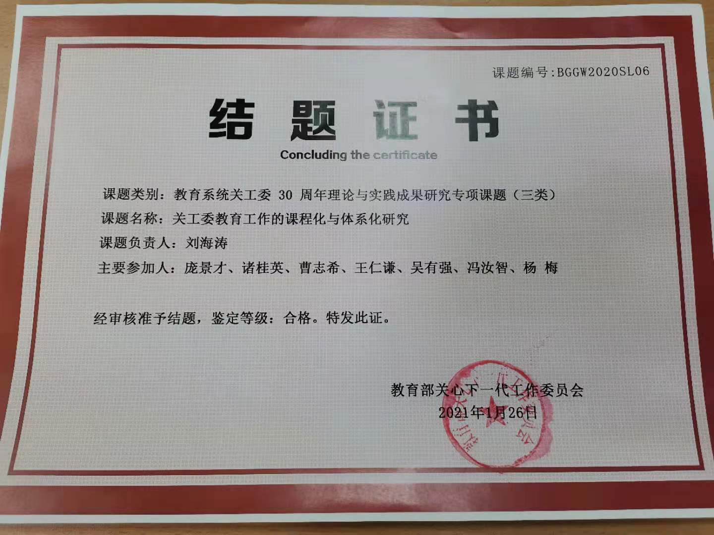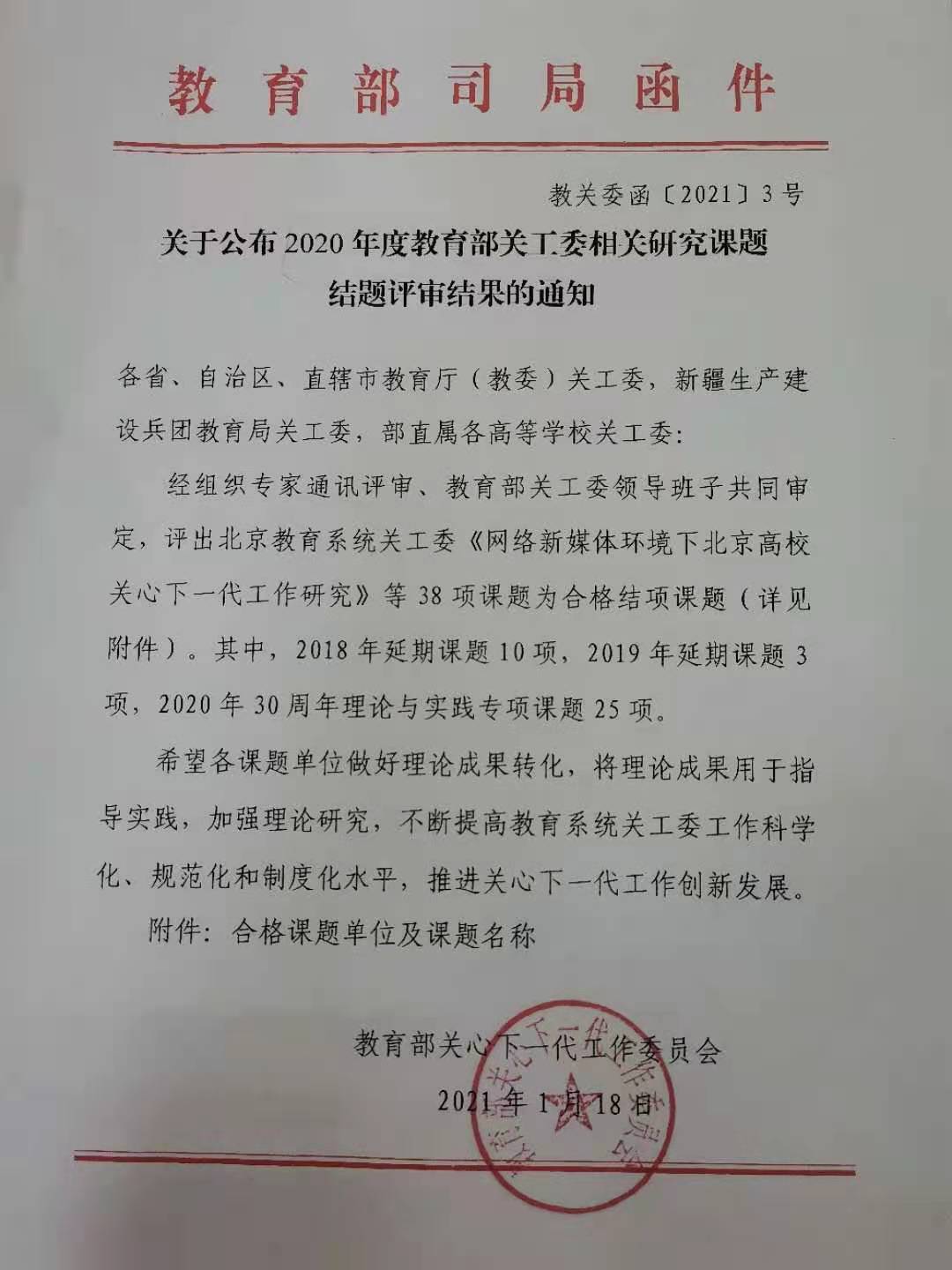 2021年1月18日,教育部关心下一代工作委员会发布“关于公布2020年度教育部关工委相关研究结题评审结果”的通知,我校关心下一代工作委员会撰写的课题《关工委教育工作的课程化与体系化研究》正式通过合格结题。该课题由我校关工委主任刘海涛教授主持,庞景才、诸桂英、曹志希、王仁谦、吴有强、冯汝智、杨梅等老师参与。