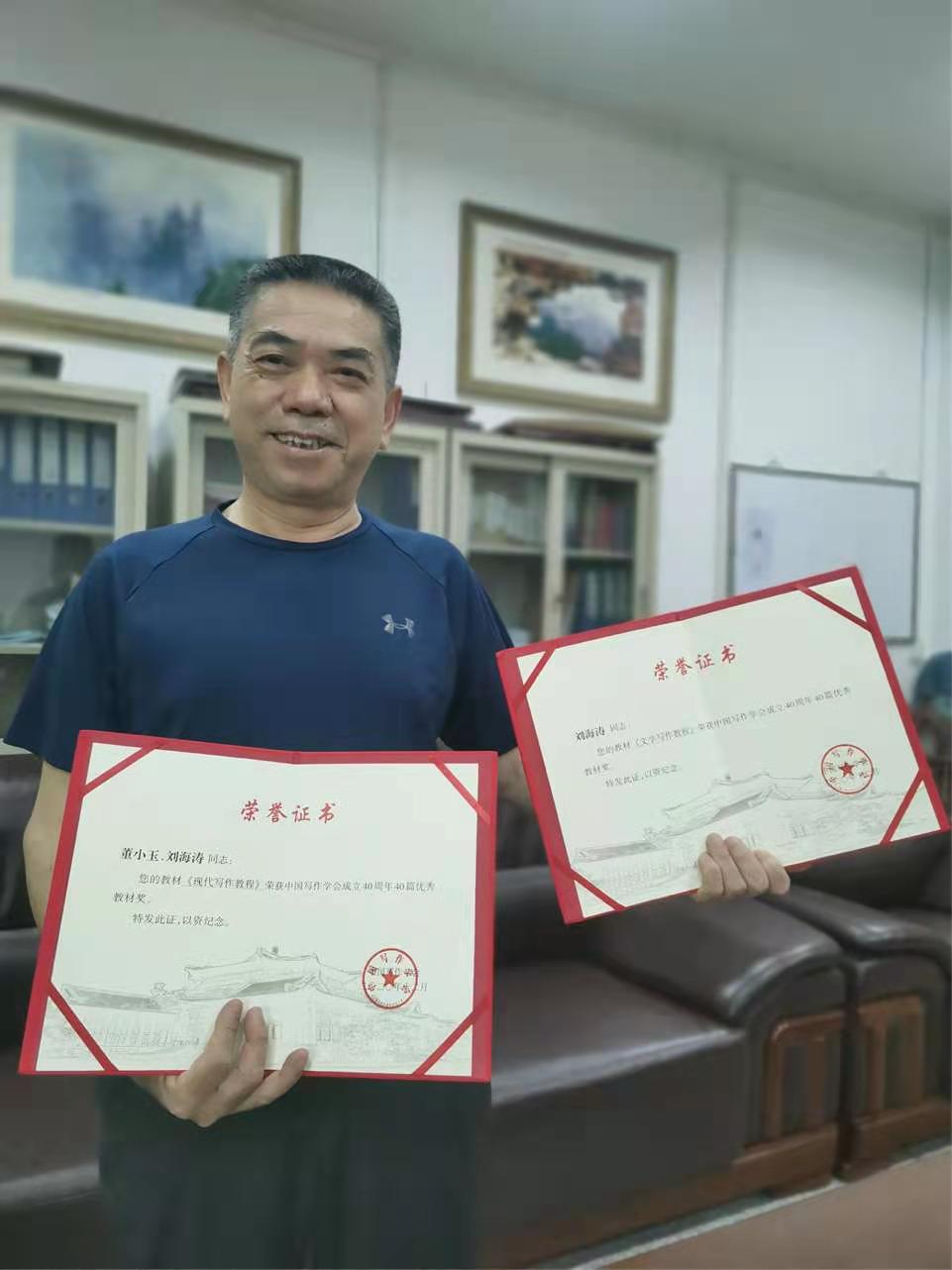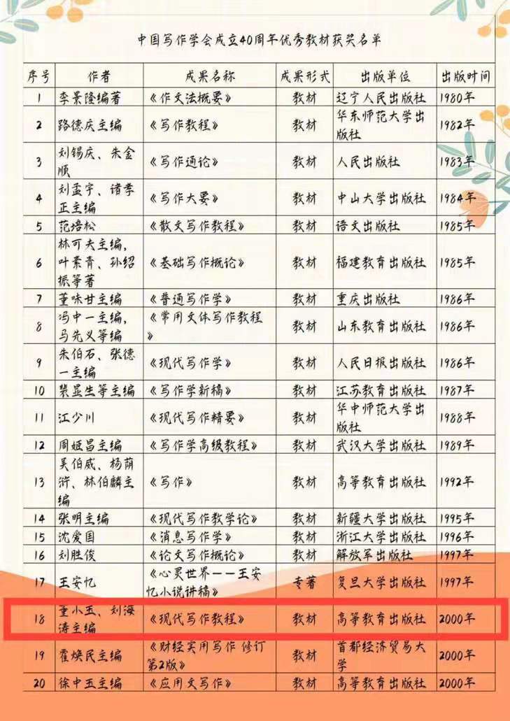 春风送暖春色美,喜鹊报喜佳音至。近日,我校刘海涛教授在高等教育出版社出版的《文学写作教程》,以及董小玉教授为第一主编、刘海涛教授为第二主编的《现代写作教程》荣获“中国写作学会成立40周年40部优秀教材奖”。