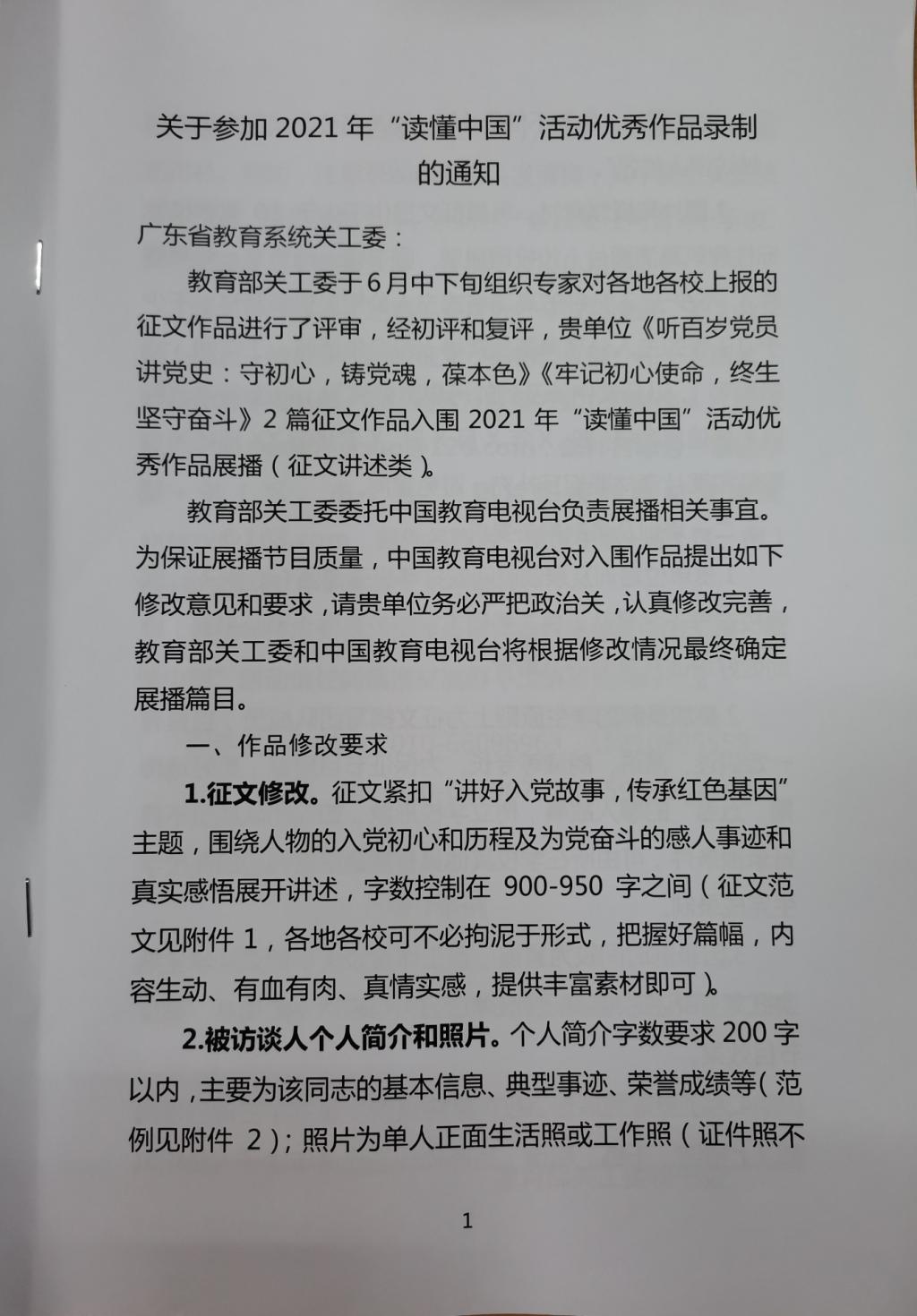 据了解,全省152所本科高校、高职高专共收到“读懂中国”活动征文213篇(我校报送征文5篇),向教育部关工委推送征文18篇,经初评和复评,最终我校和仲恺农业工程学院各1篇征文入围2021年“读懂中国”活动优秀作品展播。