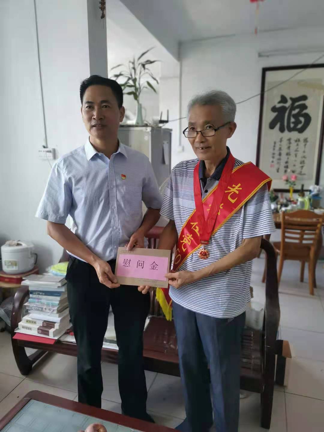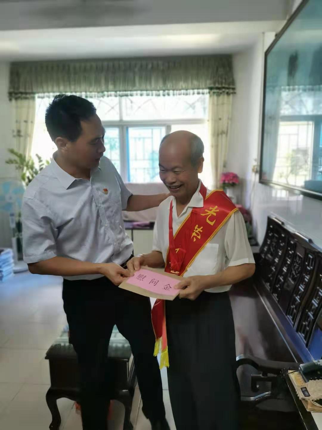 庞景才为王炳加颁发纪念章、送上慰问金