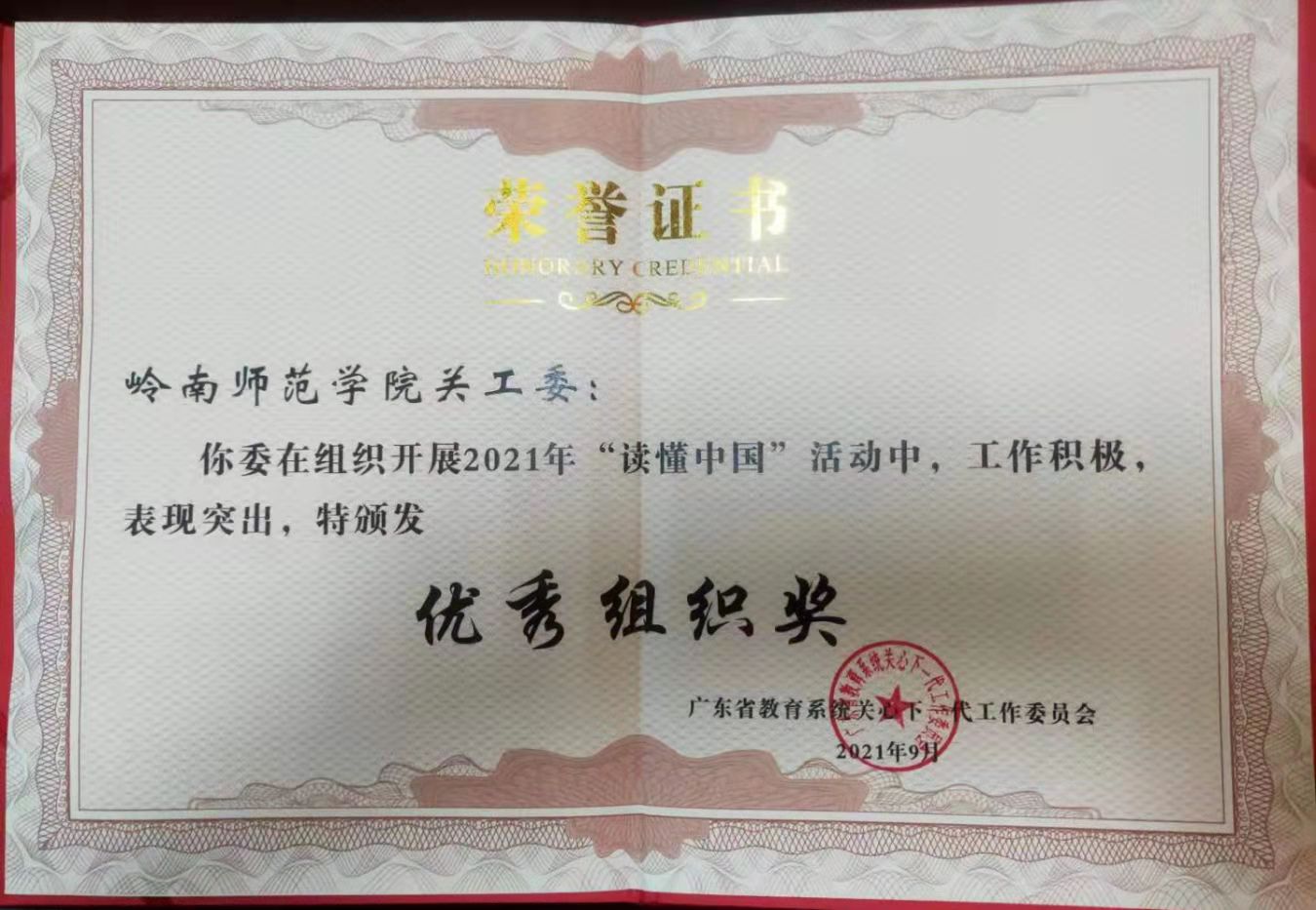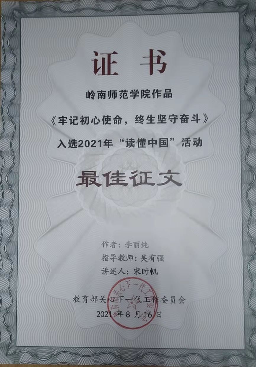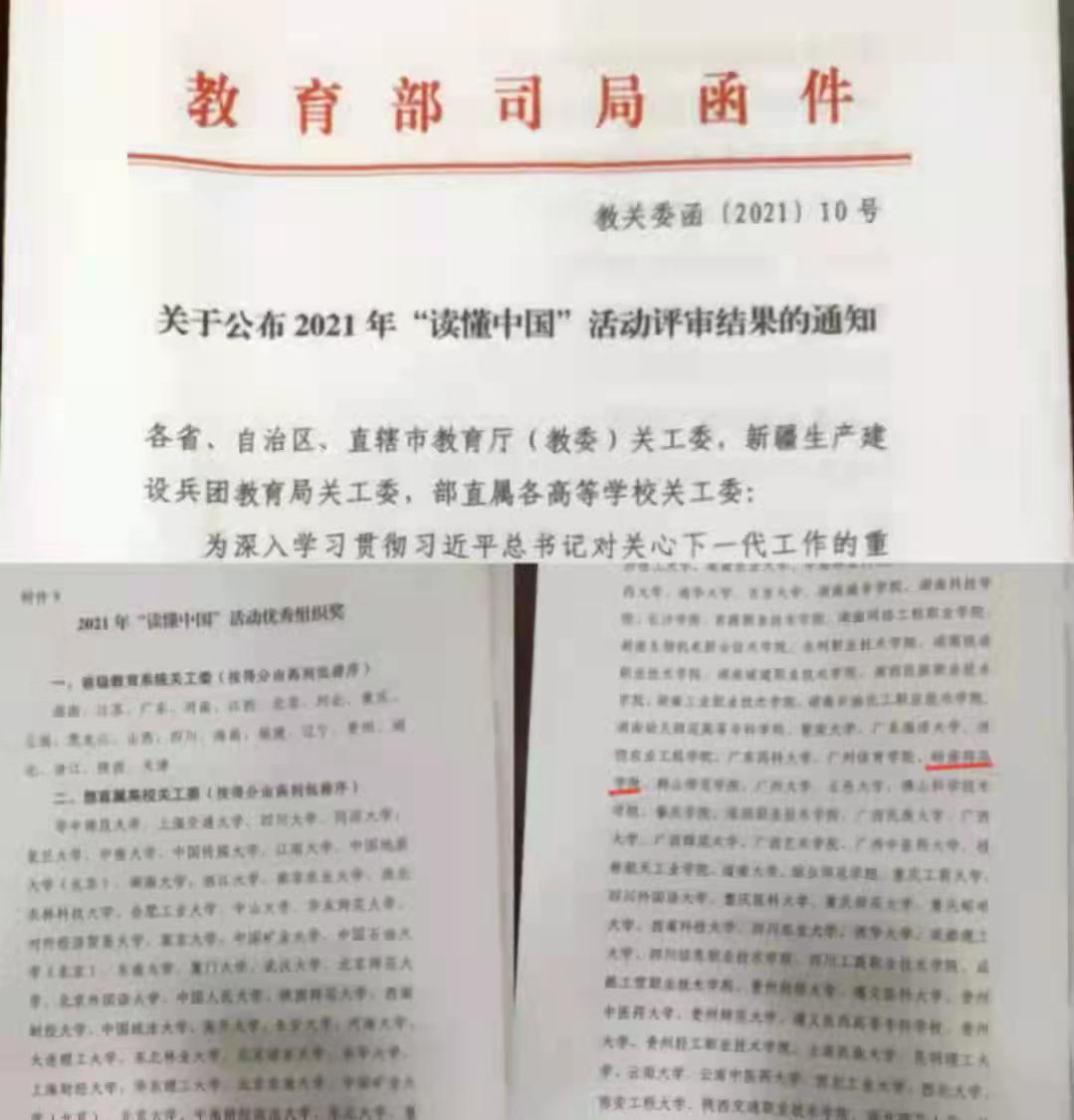 近日,教育部关工委和广东省教育系统关工委公布2021年“读懂中国”活动评审结果,我校关工委荣获教育部关工委和广东省教育系统关工委2021年“读懂中国”活动优秀组织奖;校关工委吴有强副主任指导生命科学与技术学院学生李丽纯撰写的《牢记初心使命,终身坚守奋斗》征文,荣获教育部关工委2021年“读懂中国”活动最佳征文奖。