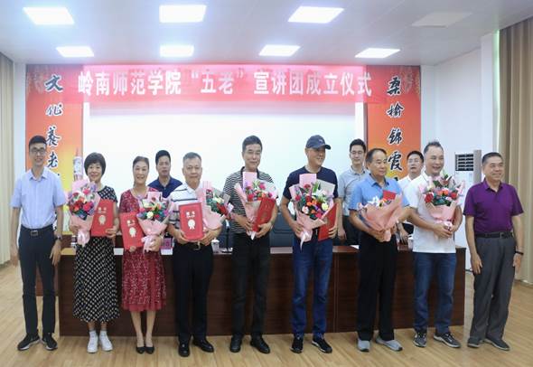 岭师新闻中心讯:7月8日,学校正式成立“五老”宣讲团,发挥老同志的特长和优势,深入湛江市大中小学校园开展理论宣讲和思想政治教育。学校党委副书记黄达海出席成立仪式,并为宣讲团成员颁发聘书。