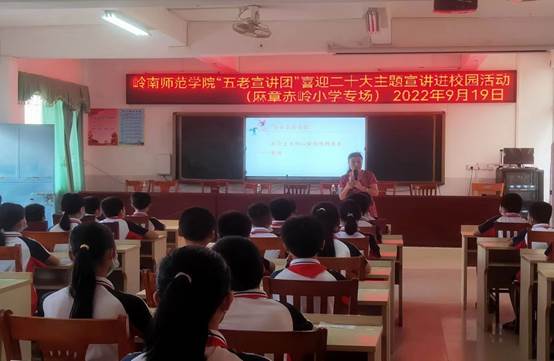 “育树育根,育人育心”。近日,岭南师范学院“五老宣讲团”成员李爱群副教授分别深入湛江市麻章区赤岭小学和湛江市第十六小学开展专题宣讲活动,受到了所在学校师生的热烈欢迎。