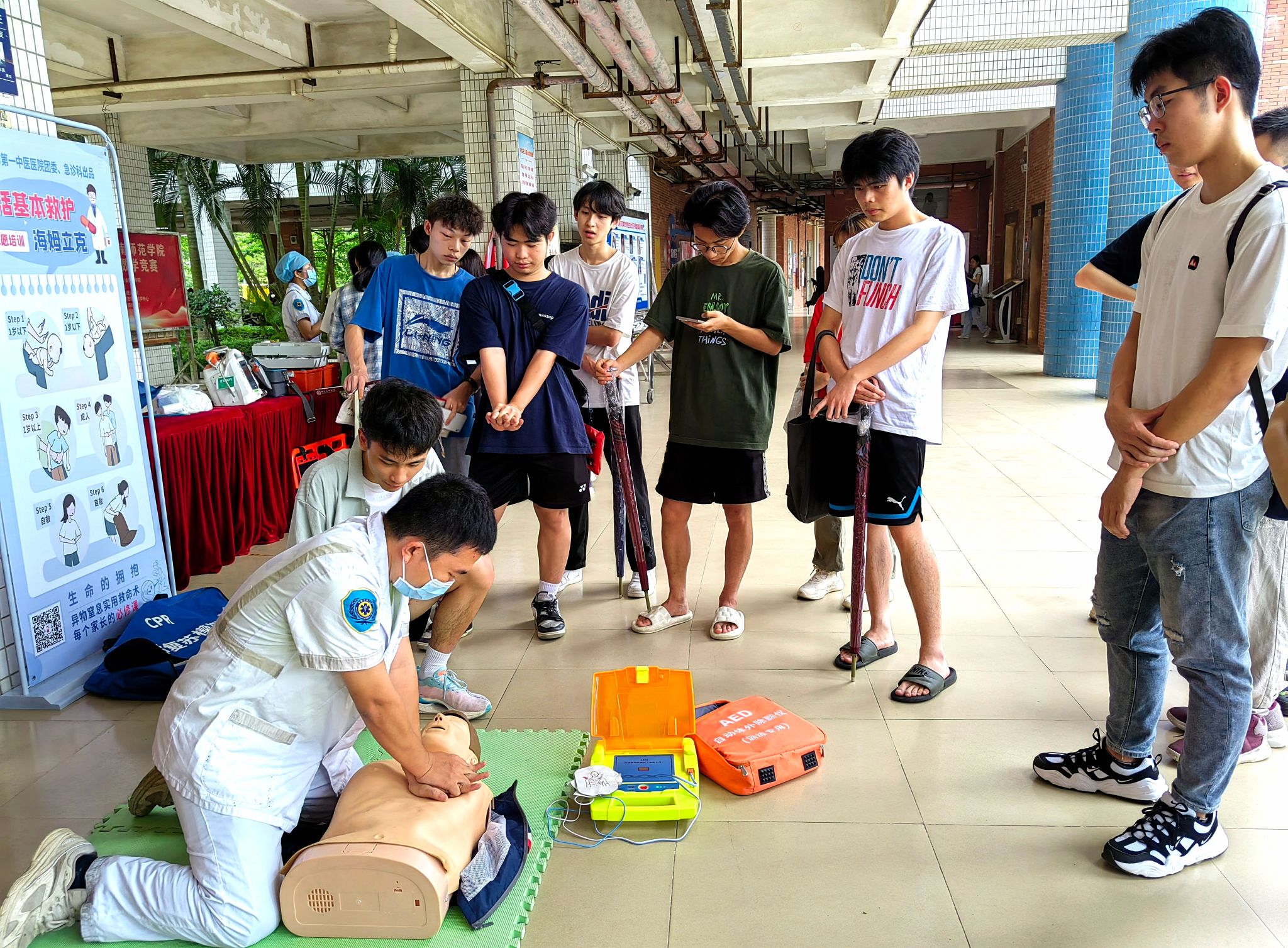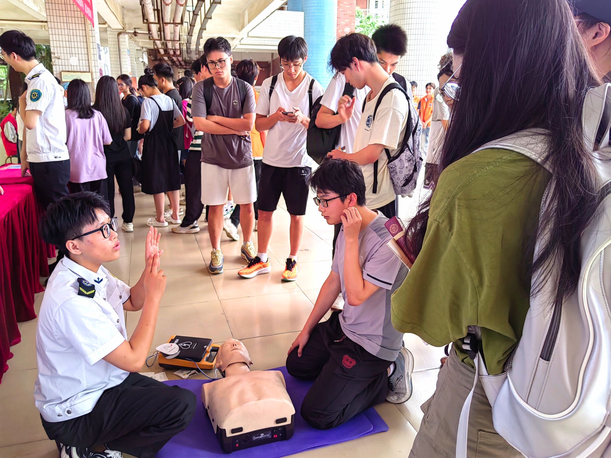 湛江市第一中医医院副院长周辉、校关工委秘书长欧海清、校团委书记林仲彦、门诊部主任梁成义等亲临现场协调组织。宣传工作组培训导师和志愿者认真地向同学们培训讲解如何拨打120急救电话,如何开展生活基本救护“心肺复苏术”“海姆利克急救法”“气管插管法”“心脏按压机操作使用”,耐心地为同学们科普中医药文化、辨识中草药等内容。同学们仔细倾听、虚心请教、踊跃参与、亲身体验心肺复苏术与海姆利克急救法,气氛热烈活跃。