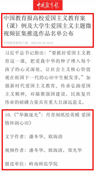 近日,中国教育报公布了“高校爱国主义教育案(课)例和大学生爱国主义主题微视频征集推选作品名单”。从全国高校报送的2000余件作品中评选出135篇优秀作品。我校关工委报送的《“举旗逐光”:丹青刻纸绘英模 爱国情怀润心田》凭借其创新性和实践成效脱颖而出,成功入选爱国主义教育案例。