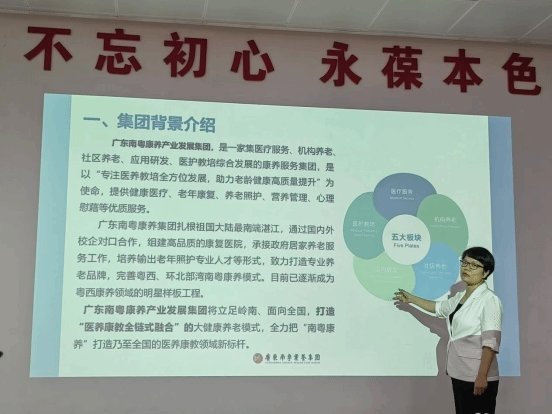 广东南粤康养产业发展集团居家主任陈少萍在会上介绍了集团的发展概况,并针对高校社区健康养老服务的运营构想做了阐释,希望能发挥自身在康养领域的专业优势,打造个性化、专业化的医养服务方案,为岭南师范学院退休教工的健康生活保驾护航。