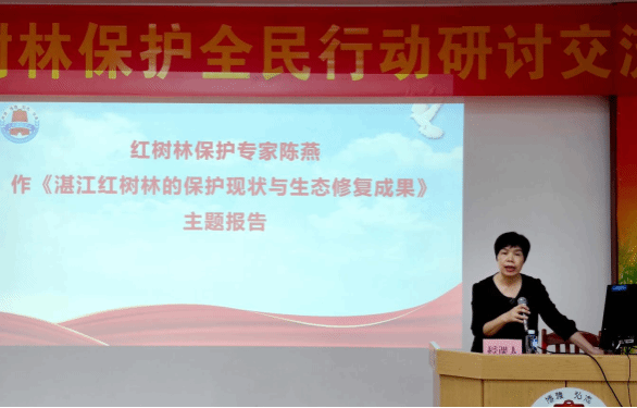 红树林保护专家、原生命科学与技术学院陈燕教授作《湛江红树林的保护现状与生态修复成果》主题报告。她重点从“什么是红树林”“我国红树林保护”“湛江红树林保护修复成果”“红树林的合理利用”等四个方面,以详实的数据和鲜活的案例作了专业解读,全面展现了近年来湛江红树林生态系统多样性、稳定性的提升成效,让与会者直观感受“海岸卫士”的修复奇迹。