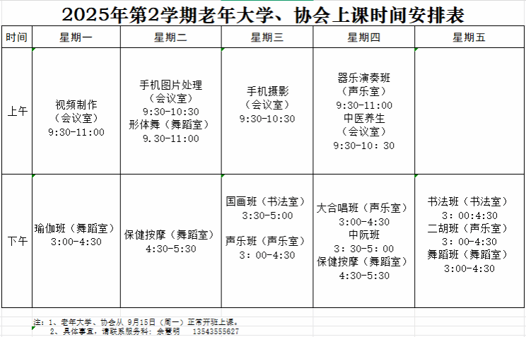 为保障学校老年大学2025年第二学期教学工作有序开展,方便大家参与课程学习及沟通联络,现将本学期课程安排、开班时间及师生联系方式等信息公告如下: