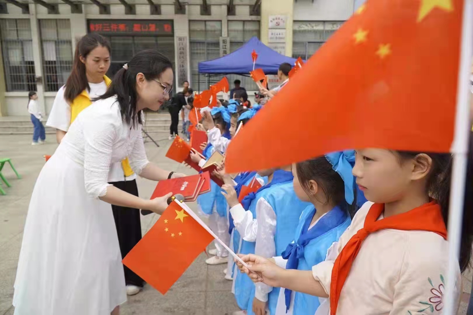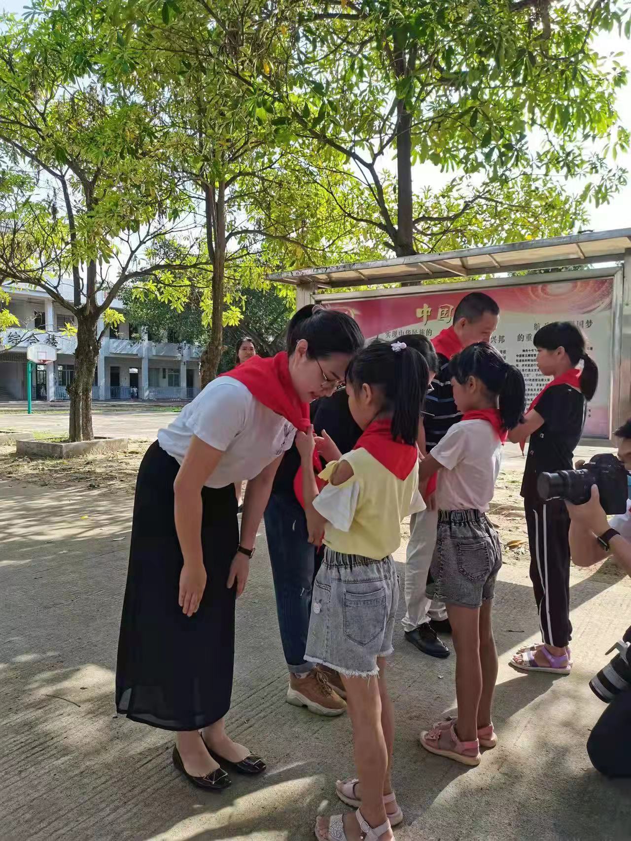 女孩为罗玉琴戴上红领巾(罗玉琴供图)