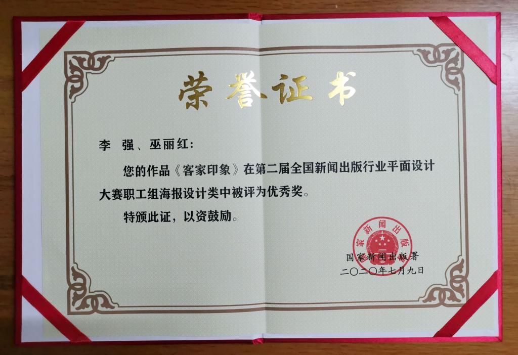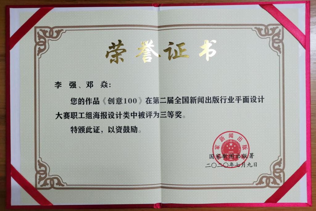 佳音频传,喜事连连。11月10日,美术与设计学院李强副教授收到了主办方寄来的获奖证书,他在国家新闻出版署组织举办的第二届全国新闻出版行业平面设计大赛中,海报设计作品《创意100》、《客家印象》在职工组的众多参赛作品中脱颖而出,分别获得三等奖与优秀奖。