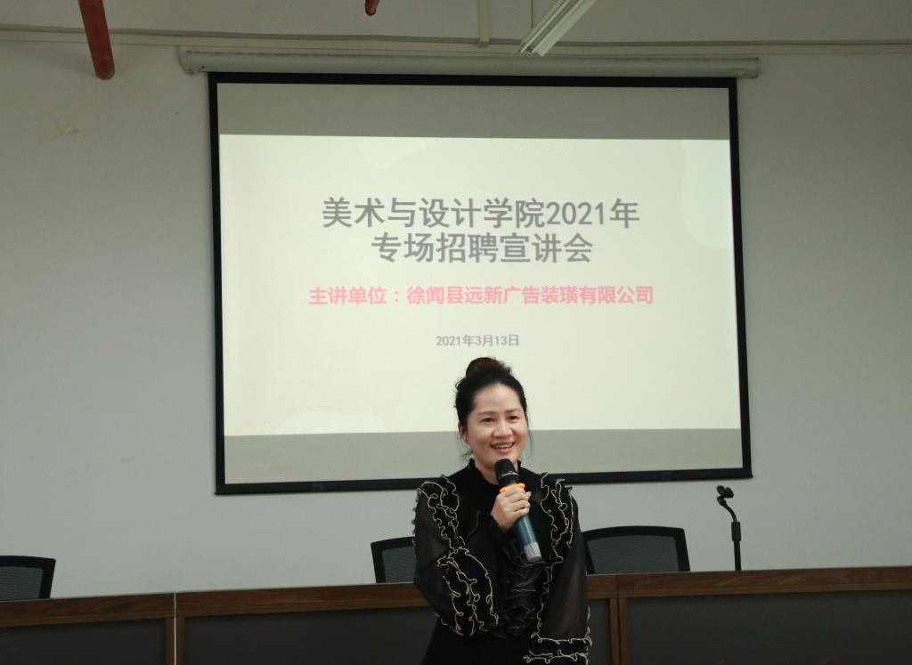 3月13日上午,美术与设计学院在艺术楼A201室举办线下企业招聘专场宣讲会。深圳市书之林文化发展有限公司、深圳市符氏书画教育有限公司、东莞市香市书画院、方舟学院、广东盛视觉集团有限公司、徐闻县远新广告装潢有限公司等校友企业在场进行了专场招聘宣讲活动。