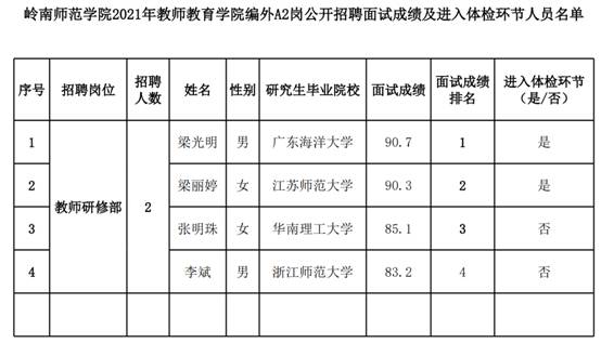 根据《岭南师范学院教师教育学院2021年编外A2岗工作人员招聘公告》有关规定,经过个人报名、资格审查、面试等程序,现结合应聘人员的面试成绩,根据面试成绩从高分到低分排序,按1:1比例确定体检人员,确定进入体检环节人员名单,详见下表: