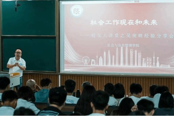 吴俊映执行总监首先分享了对社工行业未来发展前景的见解,从政府政策、薪酬发展等方面向同学们展示了社工在当前生产力水平不断提高的社会中所起到愈发明显的作用。她认为,未来在政府和社会的共同努力推动下,社会工作行业一定会大放异彩。