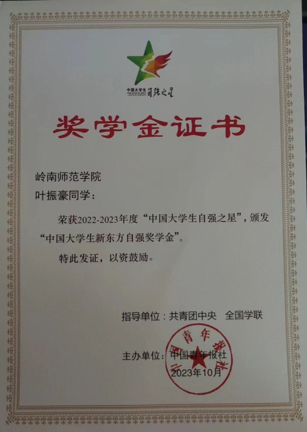 叶振豪同学获2022-2023年度“中国大学生自强之星”