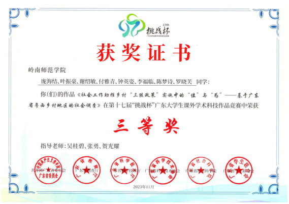 由本专业教师撰写的2份社会工作服务案例总结报告分别在2019年和2023年获民政部领导肯定性批示,还有2份咨询报告分别于2016年和2019年被湛江市人民政府采纳。本专业教师还曾负责执行了广东省大型公益行动“集思公益,幸福广东”支持妇女计划中的6个项目,以及广东省禁毒社会工作人才培育项目,项目经费达170余万元。