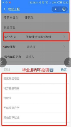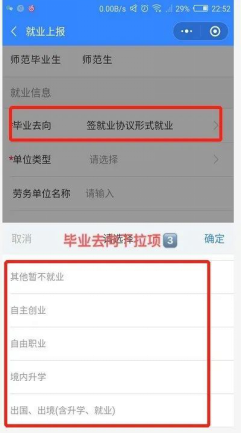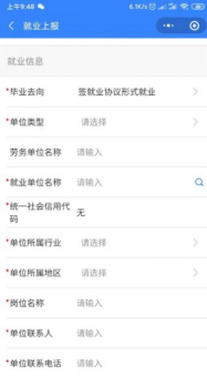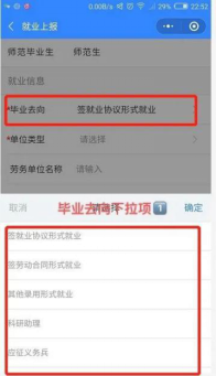 不同的毕业去向类型所需要填写的信息是不同的。信息填写完毕后提交,等待院校进行审核。可填报的就业信息包括:签就业协议书、签劳动合同、其他录用形式、国家基层项目、地方基层项目、待就业、不就业拟升学、其他暂不就业、科研助理、应征义务兵、其他暂不就业、自主创业、自由职业、境内升学、出国、出境(含升学、就业)。
