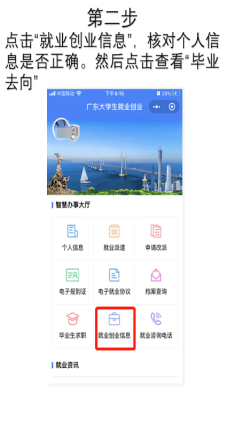 2.如果已签就业协议书、签劳动合同(或单位开具的入职证明)、创业、考研成功、应征入伍等,在3天内登陆“广东大学生就业创业”微信小程序填报就业信息。