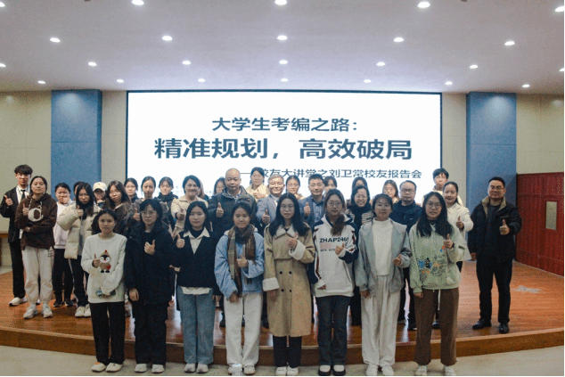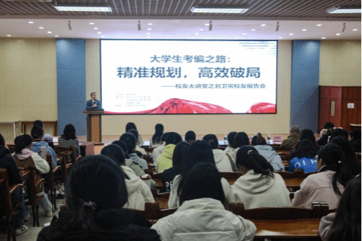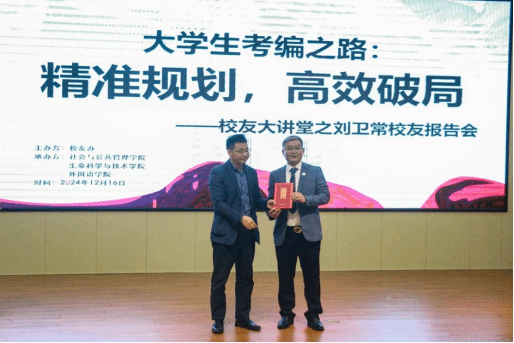 12月16日,社会与公共管理学院于弘雷楼511室举办校友大讲堂活动。我校1998届校友刘卫常受邀回到母校,以“大学生考编之路:精准规划,高效破局”为主题开展了一场精彩的报告会。社管院张勇院长、邓蔚婵副书记,外语院陈永国书记、杨建伟副书记,生科院陈蓉老师以及各协办单位的辅导员代表参加了本次报告会。报告会由社管学院邓蔚婵副书记主持。