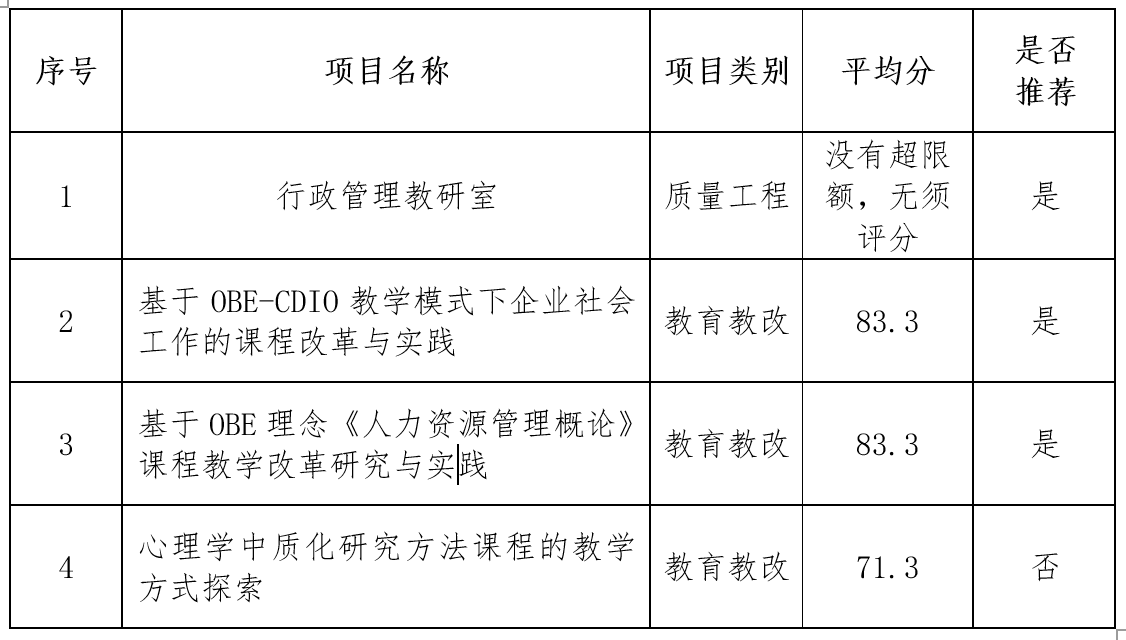 根据学校教务处《关于开展2024年度广东省本科教学质量与教学改革工程项目申报推荐工作的通知》(教务〔2024〕125号),我院截止2024年10月14日共收到4份申报材料,经个人申请、校外专家通讯评审,评审推荐结果见表1。