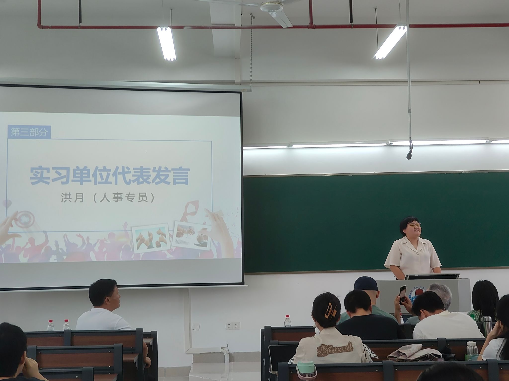 作为实习单位代表,深圳市维度数据科技股份有限公司的人事专员洪月发表了讲话。她向同学们介绍了维度的发展概况、组织框架与主要业务,提到目前维度在市场调研方面有丰富的经验,与本专业的服务对象需求评估和服务效果评估等方面有很大地联系。作为校企联合培养基地,热烈欢迎各位感兴趣的2020级社会工作专业同学们前来实习,发挥自身所长,与维度共同成长。她还提出了两点实习要求:一是专业性,二是稳定性,强调表达力、责任心、抗压力以及服从性是企业招聘的重要条件,使在场同学对职场工作有了初步地了解。