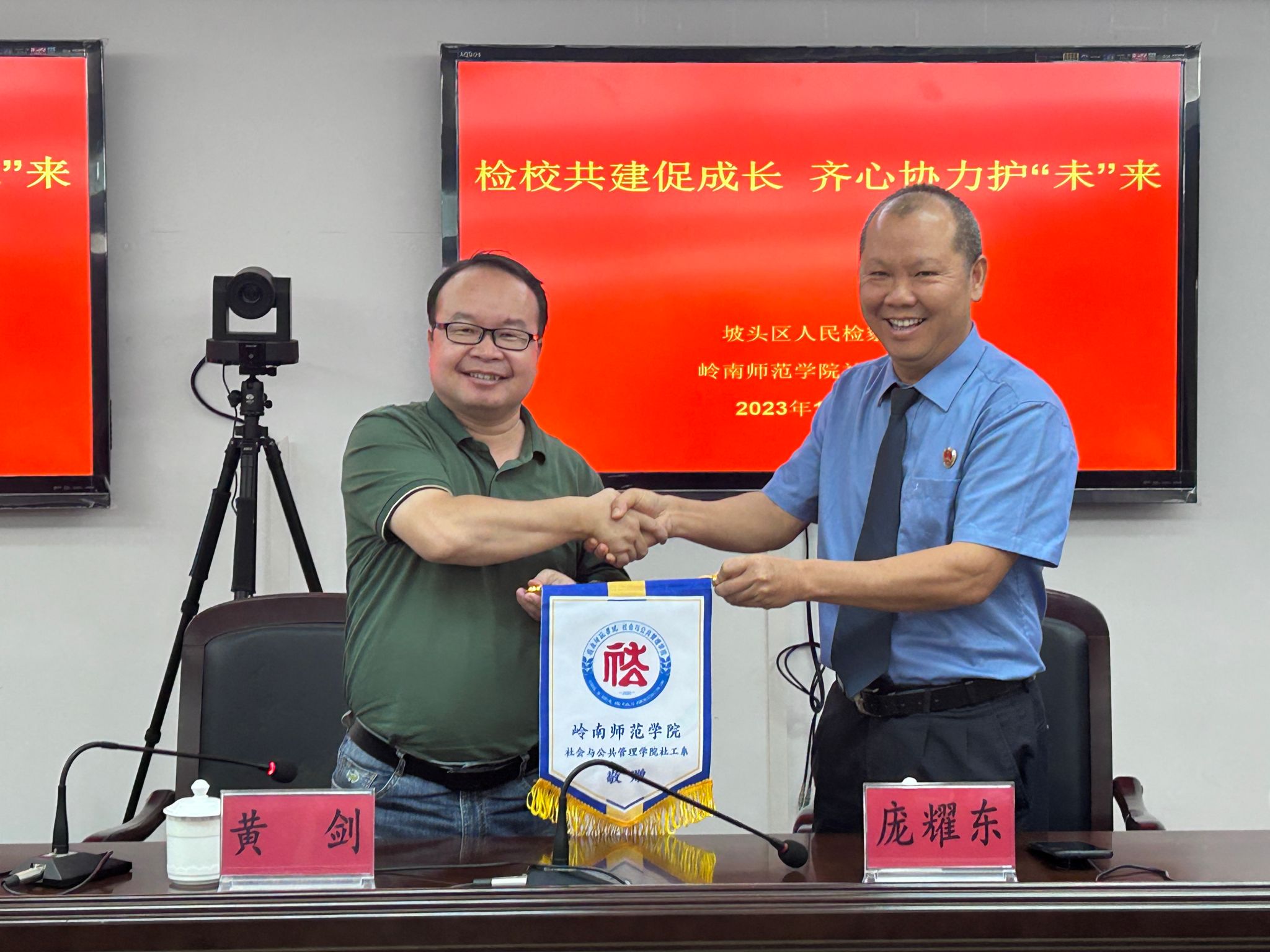 随后,大家移步至检察院的会议室,参加了以“检校共建促成长,齐心协力护未来”为主题的座谈会,检察院第一检察部主任邓建团担任主持人。会议伊始,邓建团主任围绕未成年人的社会调查、跟踪帮教、行为矫治、家庭教育等内容,结合具体案例和个人感受深度剖析了司法社会工作在未成年人检察工作中发挥的积极作用。紧接着,我院和检察院就目前的司法社会工作实际、继续提升司法社会工作服务质量进一步交流经验。在互动答疑环节,学生就司法社会工作的服务理念、面临的伦理困境等提出自己的困惑,检察官们一一进行了详细解答,提升了到访学生对于司法社会工作实务的认识。最后,黄剑副院长代表学院向坡头区检察院赠送我院交流旗。