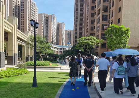 随后,工作人员带领学生走访了康宁社区辖区的小区,使学生对社区的小区分布及周围的环境均有了一定的了解。部分同学发现社区内没有停放电动车,工作人员回应到,为了维护社区的交通秩序,电动车统一存放在地下停车场。此外,工作人员提到社区常住人口并不多,学生在走访中也发现社区中的很多商铺并未装修营业,居民的活动场所主要集中在儿童娱乐区。