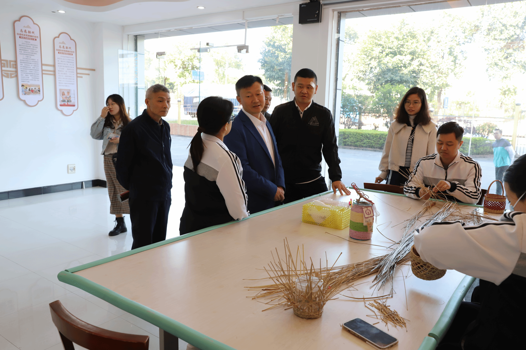 11月17日上午九点半参访组来到东莞残疾人托养中心。参访组一行先后参观了莞草编制工作室、手工艺品展览室、中心文化长廊展厅、各部门和学员生活区,了解托养中心运营管理、护理照护、职业教育等特色托养服务模式。参观结束后,双方举行了座谈。托养中心老师王曙光,副老师黄惠华、副老师方庆生、办公室林老师及驻点社工代表参与座谈会。会上,托养中心王老师详细介绍中心的运营规模、管理模式、专业人才队伍建设情况等。东莞残疾人托养中心于2008年成立,服务对象为16-59岁智力、精神多重障碍的残疾人,不收盲聋残疾人。托养中心主要是负责学员的衣食住,进行康复训练及职业教育,辅助就业,制作手工文创产品。王老师提出了托养中心下一步如何更好发展,如何与高校更好合作的思考。驻点社工代表谈了社会工作在推动残疾人社会融入方面的努力。社工培育了20名理解力、行动力相对好一点的残疾人学员志愿者,组织这些志愿者为其他学员开展力所能及的服务,这是非常有意义的探索。谢正富老师介绍了社管院社工系的发展概况、师资力量、课程设置、近年科研成果等情况,表示期待与托养中心开展合作,促进大学生专业实习和就业。谢老师表示,希望社会工作专业学生有机会参与残疾人服务,让学生发挥自身特长,助力残疾人更好的融入社会。谢老师也建议托养中心可以探索更多的共建方式,影响更多的组织和市民参与残疾人帮扶服务。比如创立残疾人帮扶基金会,培育残疾人服务社会企业,建立灵活多样的合作机制等。谢老师还提出通过委托课题的方式与托养中心开展研究合作。