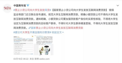 3月17日,银保监会等部门联合发布通知,禁止小贷公司向大学生发放互联网消费贷款。