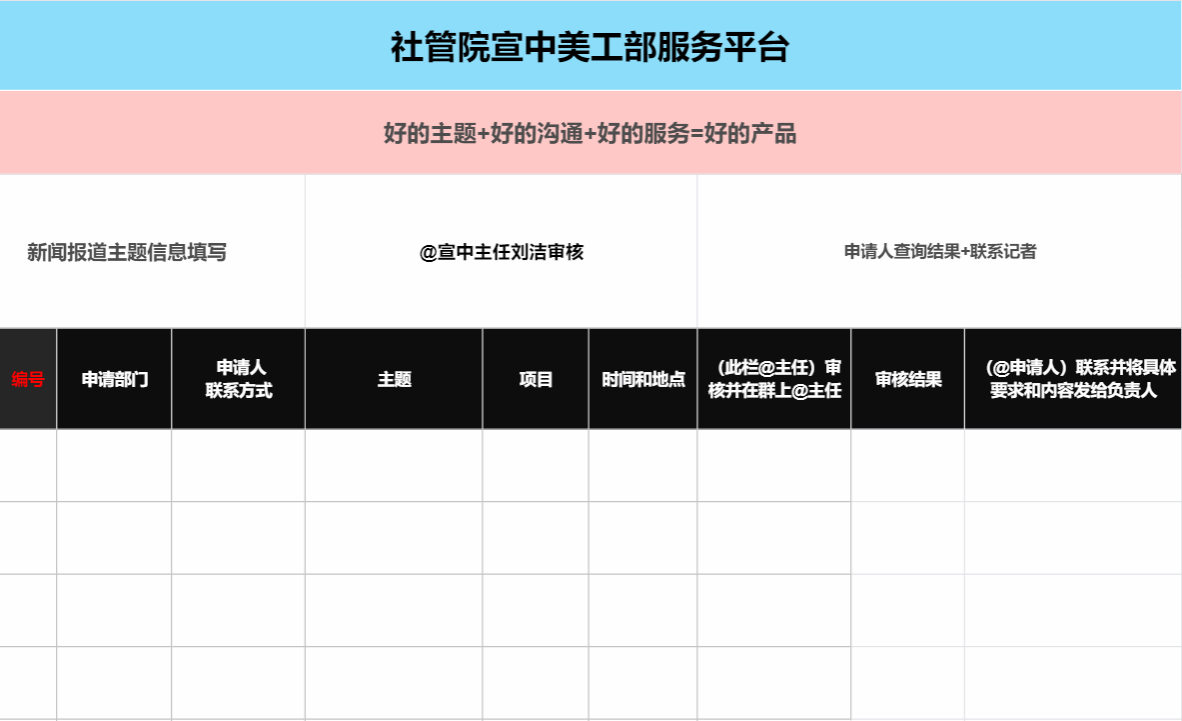 6、请认真完成申请表的填写与审核(“宣传品制作人”、“完成日期”两栏除外)若有特殊要求,请在上交申请表时与周安排人电话沟通说明,否则后果自负。
