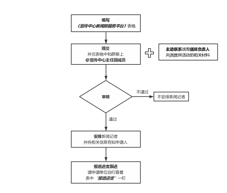 1.申请单位的申请发出并@宣传中心主任团成员后,主任将及时通知当周值班负责人查收该申请和接收申请单位提供的相关材料,新闻部审核通过之后将及时在《宣传中心新闻部服务平台》表格中填写相关信息,并在群聊内回复申请单位(回复内容:文字/摄影记者的姓名及联系方式)。