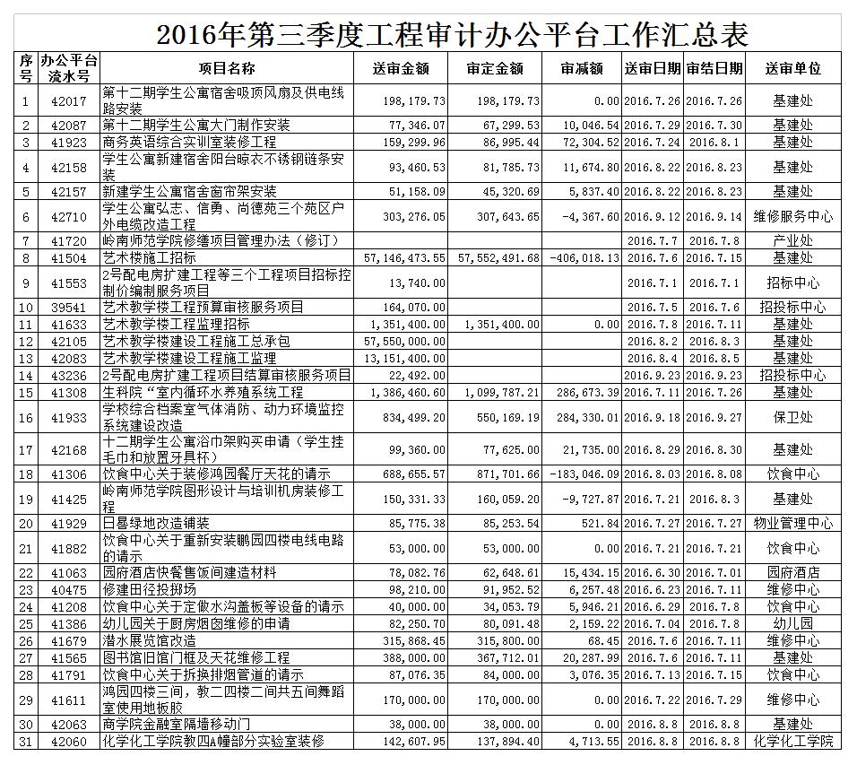 2016年第三季度工程审计科办公平台工作汇总表