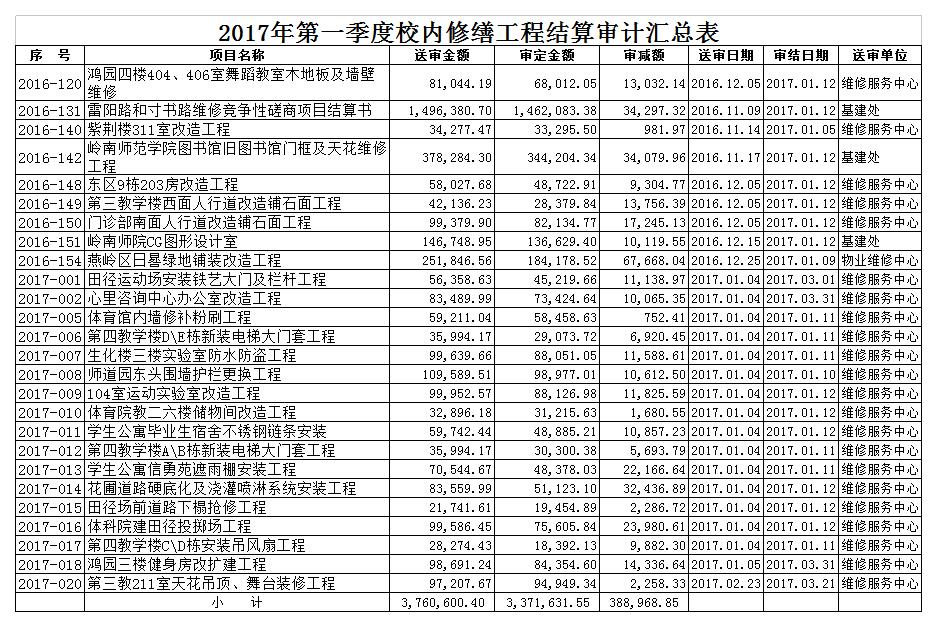 2017第一季度校内修缮工程结算审计汇总表