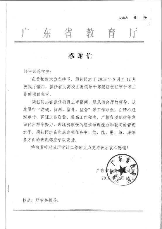 审计处两位同志分别受到省教育厅、审计厅的表扬和感谢