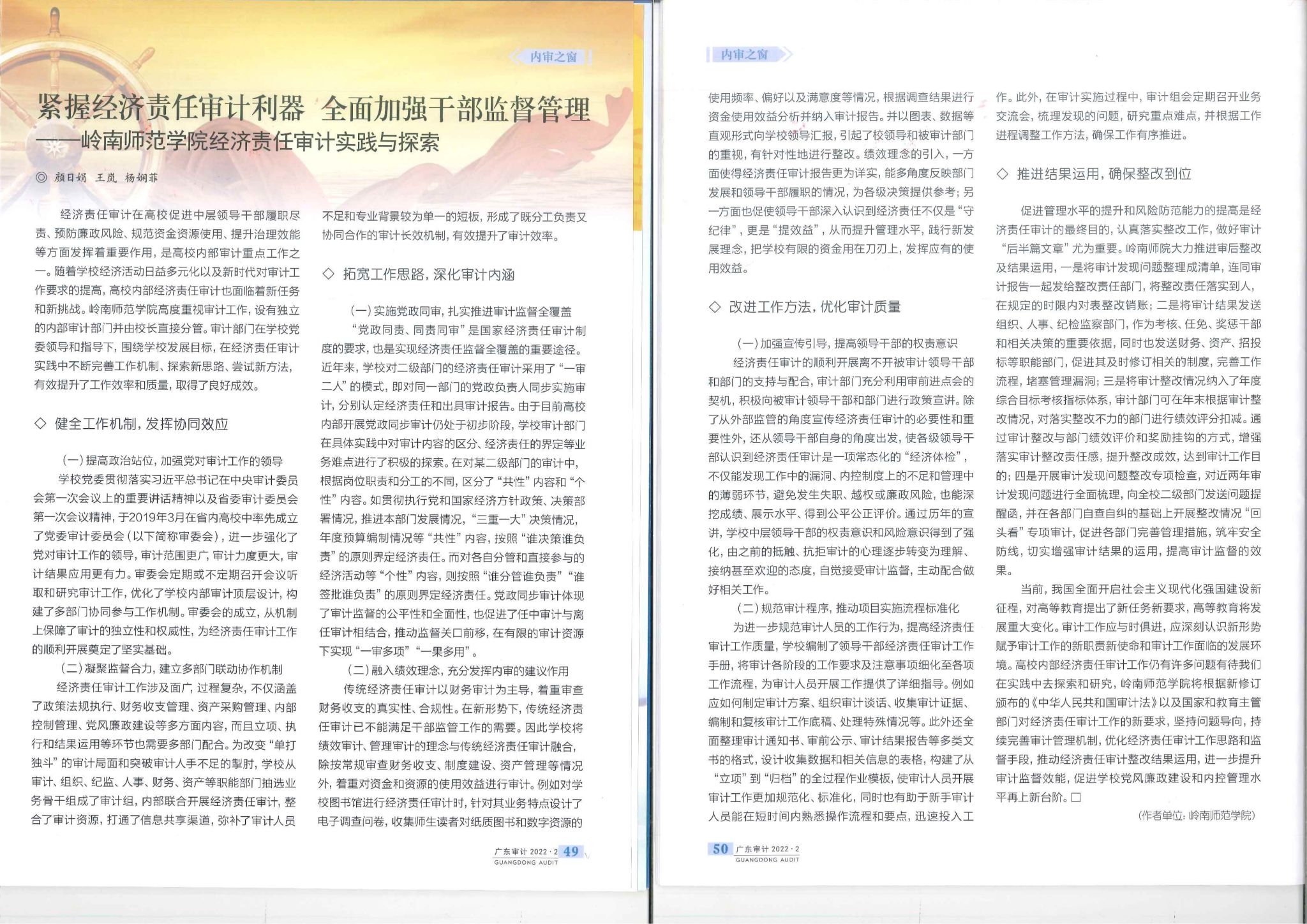 2022年,我校审计处应邀在审计专业刊物《广东审计》开设的“内审之窗”专栏中发表名为《紧握经济责任审计利器,全面加强干部监督管理--岭南师范学院经济责任审计实践与探索》的文章,文章包含了“健全工作机制,发挥协同效应”、“拓宽工作思路,深化审计内涵”、“改进工作方法,优化审计质量”、“推进结果运用,确保整改到位”共四个板块的内容,分享了我校在领导干部经济责任审计工作中总结的新思路和新方法,在全省内审部门起到积极交流和宣传的作用。