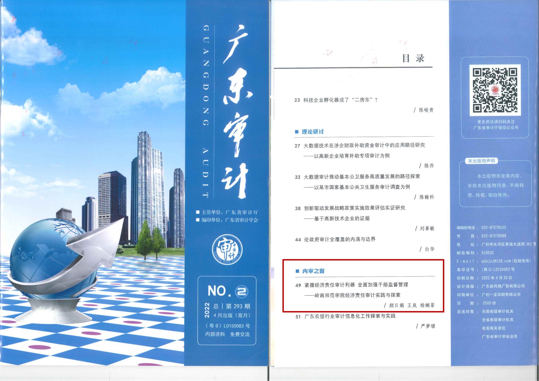《广东审计》是由广东省审计厅主办的审计专业刊物,省级期刊,中国学术期刊(光盘版)全文收录期刊,主要刊登审计理论探讨和审计科研论文,宣传审计法规知识,是广东省审计工作的权威期刊,为省内各单位间的交流提供了平台。审计处将以此为契机,在今后的工作中将继续为促进学校在规范管理、完善内控、防范风险、提高监督效能等方面努力奋斗。