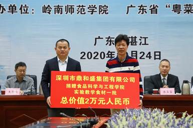 深圳市鼎和盛集团有限公司董事长何加锐作为企业家代表获邀出席会议并致辞发言。他充分肯定了与我校烹饪专业展开了良好的合作,对我校烹饪专业培养的人才质量和对企业忠诚度表示满意,表达了进一步发挥饮食企业优势和作用,深入开展校企合作协同育人的愿望,他希望食品学院以“粤菜师傅”大师工作室这一育人平台为依托,为企业培养输送更多优秀的毕业生。何加锐还向食品学院捐赠总值两万元的烹饪专业实验教学食材。我院正处级辅导员郑侯锦代表学院接受捐赠。