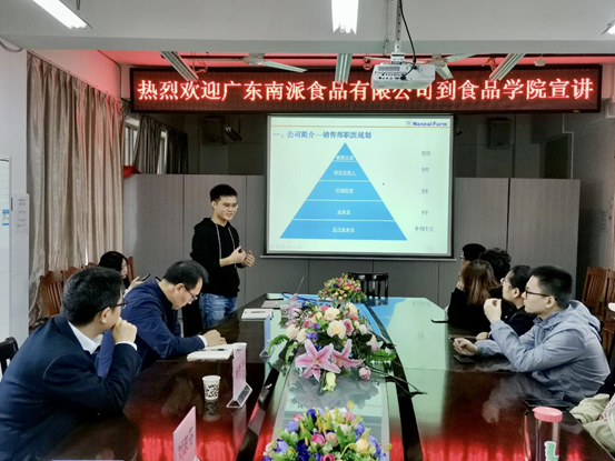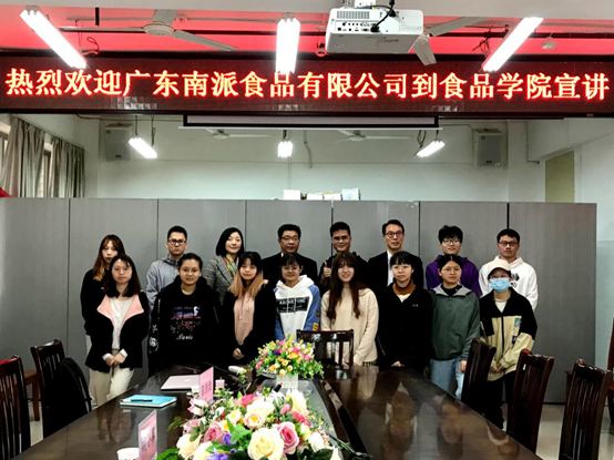 12月24日上午,食品学院邀请了广东南派食品有限公司到学校开展宣讲招聘会。宣讲会在燕雷楼D栋505室召开,学院副院长杨胜远(主持行政全面工作)、党委副书记刘淑芬,副院长胡小军、辅导员姚其元、广东南派食品有限公司人力资源部经理陈景渤以及食品学院部分同学参加了本次会议。会议由刘淑芬主持。