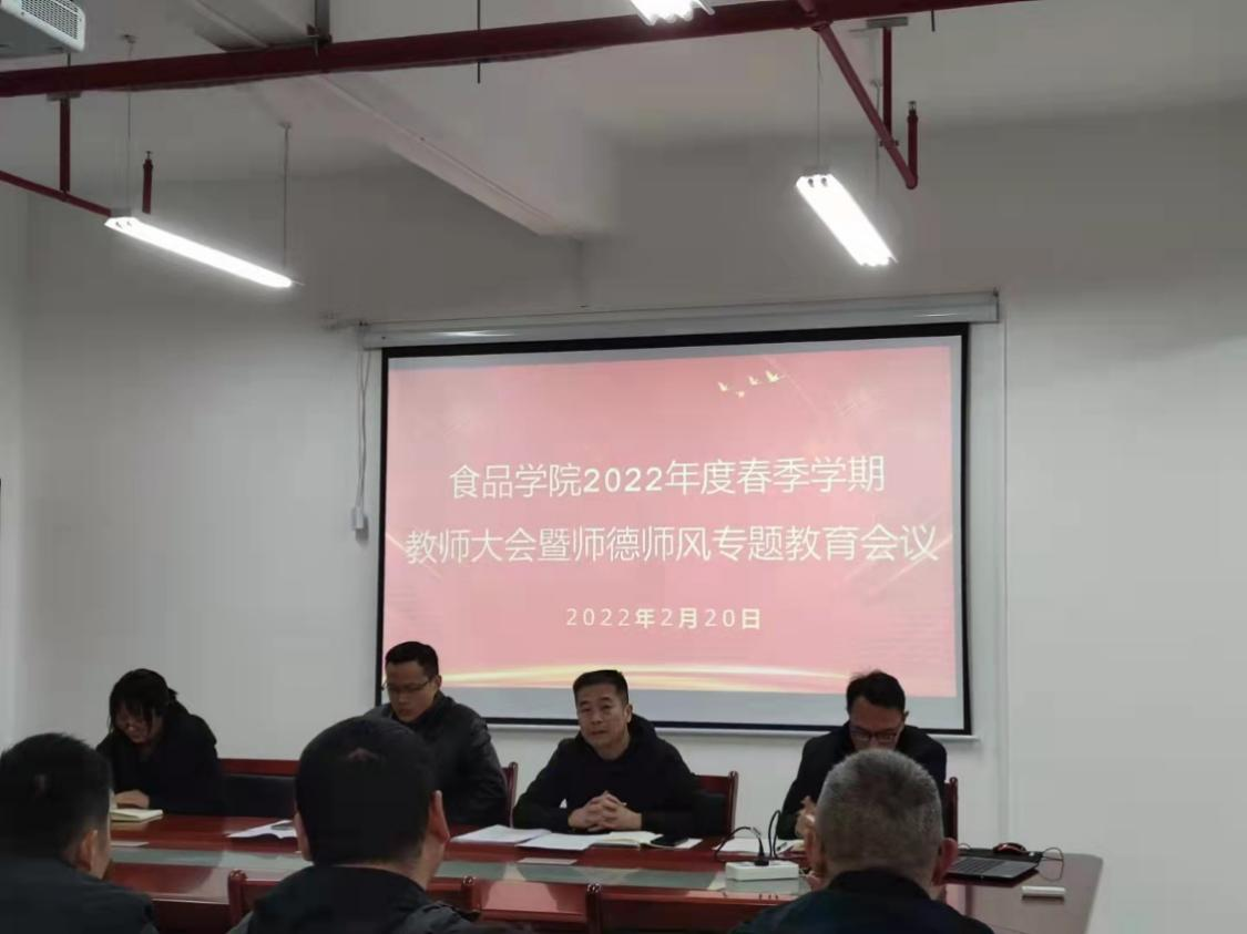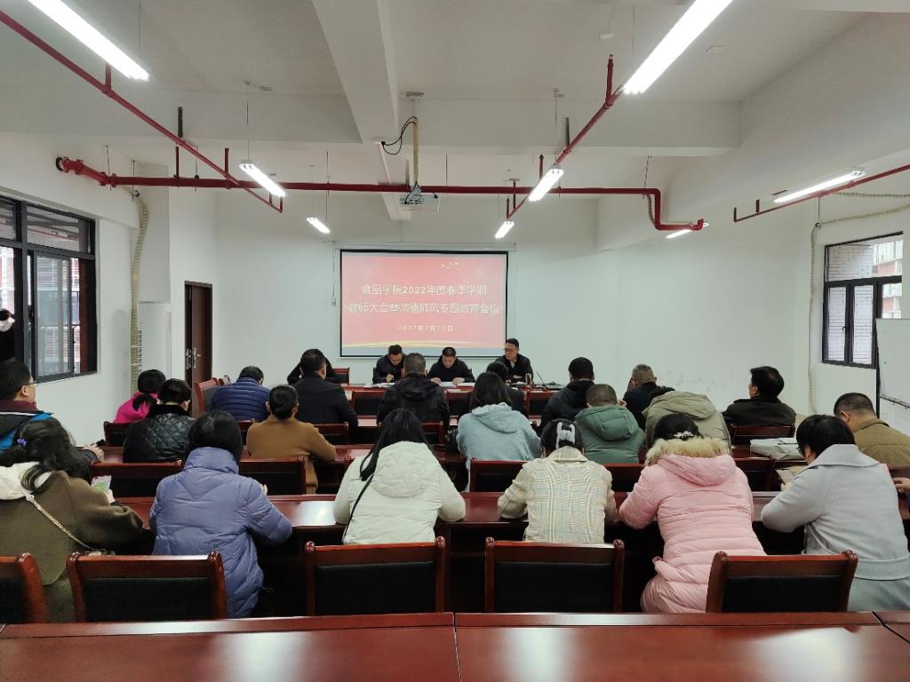 2月20日下午,食品学院于第五教学楼B栋318召开2022年度春季学期教师大会暨师德师风专题教育会议,学院全体教职工出席会议,会议由党委书记邱飞主持。