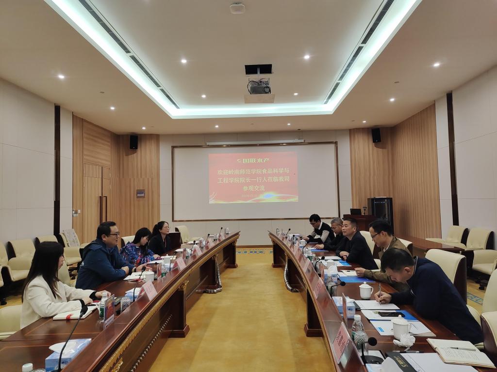 国联水产集团表示热烈欢迎,首先,带领食品学院领导、老师参观了公司的生产车间、研发试验车间、检测中心等部门,大家对公司的产品种类、经营范围以及企业文化有了更直观地认识和了解。洽谈会上,邱飞以依托企业与高校优势,补齐学生就业、实习短板为切入点,深入探究校企合作所蕴含的潜能;如今,湛江面临副省域中心、打造沿海经济带等重大发展机遇,校企合作可以充分发挥彼此的优势,高校为企业输送高质量人才,企业为高校的人才培养计划,提供资金、岗位支持,建立企业与高校的对接口,加强技术合作,实现校企双赢,进而共同促进湛江市发展。