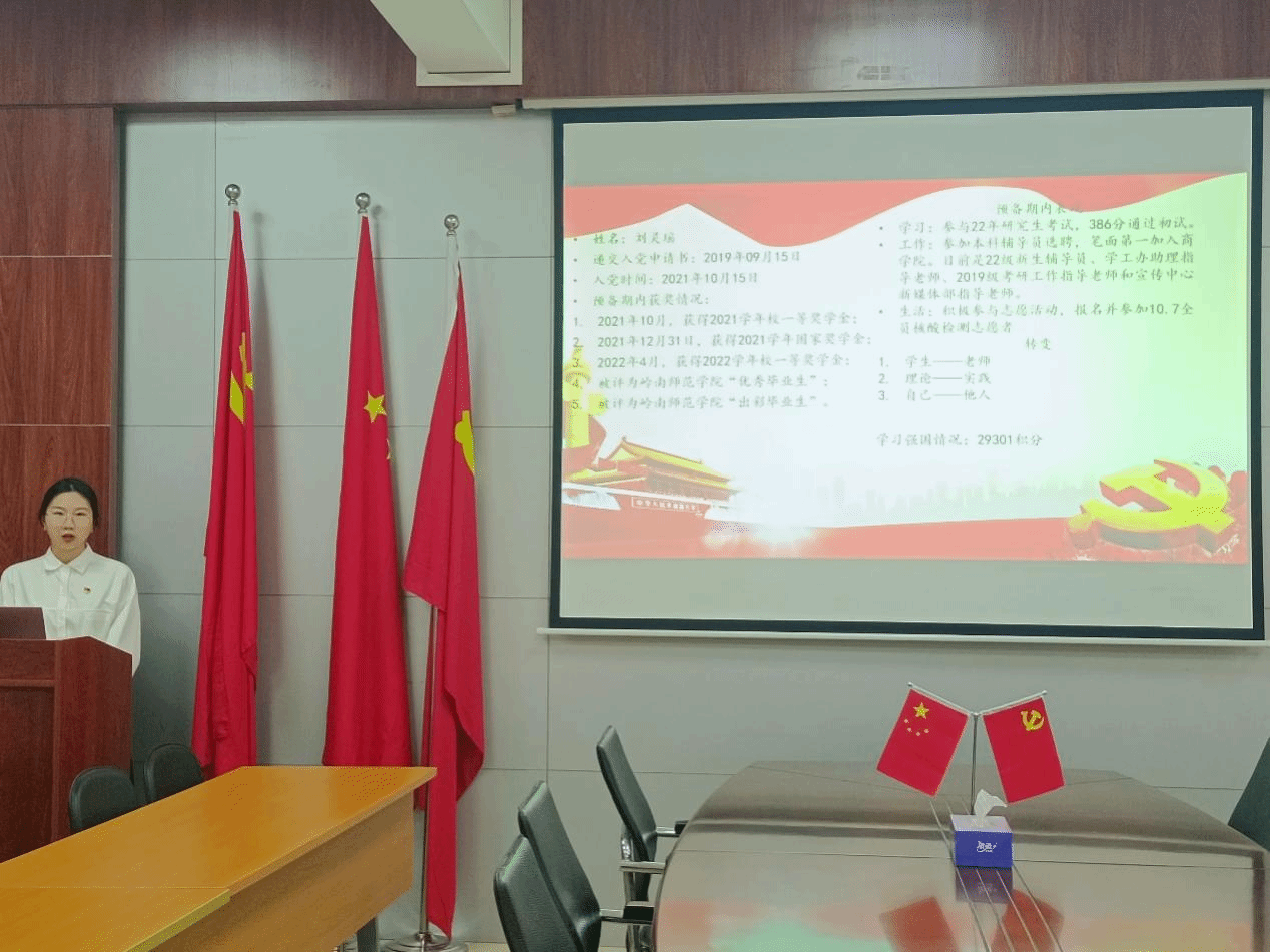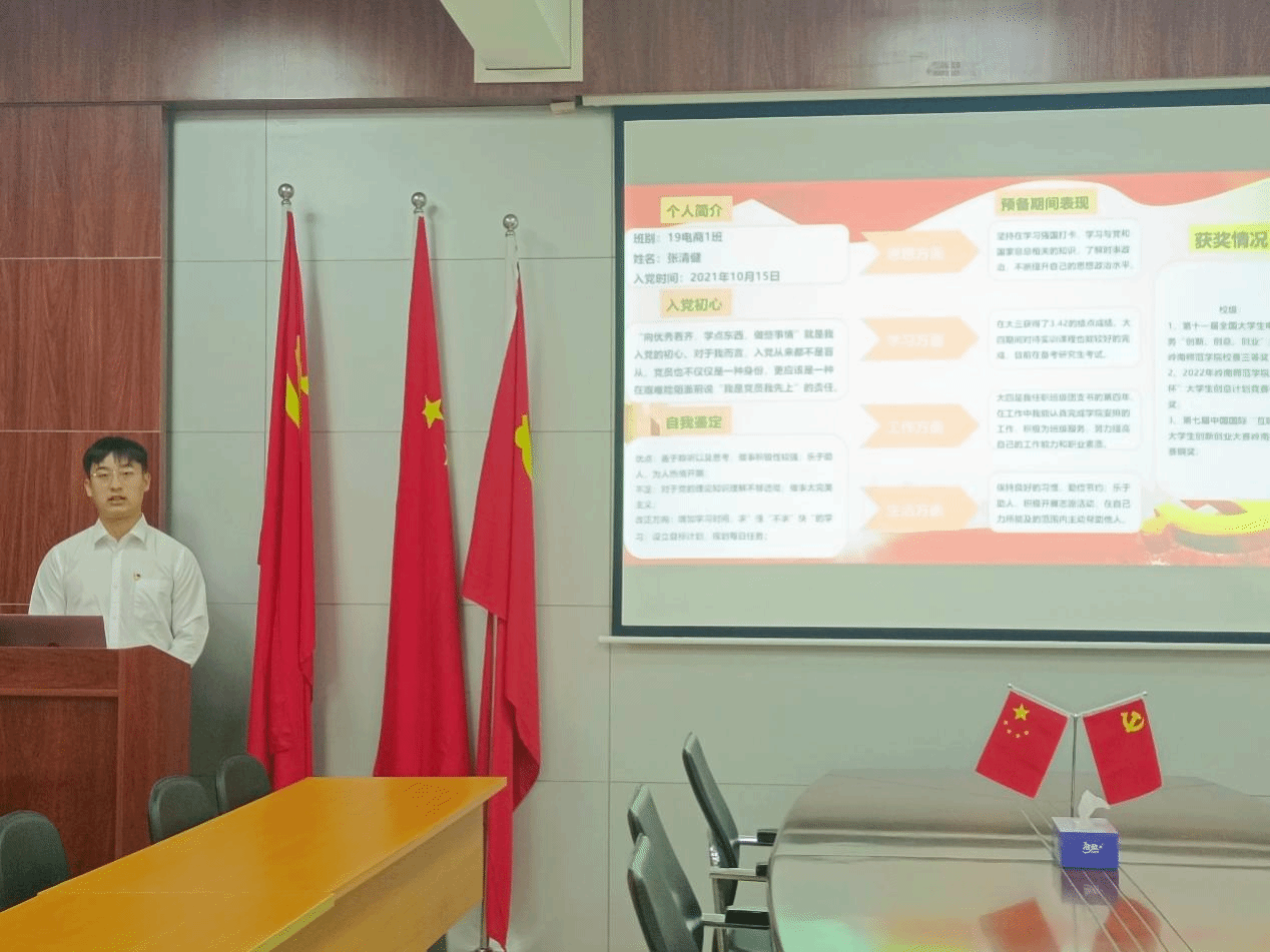 预备党员汇报个人情况。刘灵瑶、张清健等十一名预备党员分别就预备期内的学习情况、干部经历、比赛和获奖情况、自我鉴定以及入党动机等五方面进行汇报。预备党员们表示,成为一名光荣的共产党员,会继续严格要求自己和提升自己,用实际行动践行为人民服务的初心,在全心全意为人民服务中实现个人价值,成为实现我国第二个百年目标的主干力量。